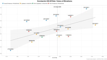 4. Tendencia general y proyección: La regresión indica una correlación positiva moderada a alta (+60%): a mayor ICG, mayor proporción de votos al oficialismo. Sin embargo, los puntos "fuera de serie" en contextos extremos (2011, 2003, elecciones de medio término) muestran que el ICG explica solo una parte del comportamiento en los comicios, en el complejo mapa electoral argentino. Factores coyunturales como la economía real y el nivel de actividad, la dinámica de consumo y el nivel de empleo, los liderazgos personales, el contexto regional e incluso shocks externos, como bien es de esperar, condicionan fuertemente los resultados del análisis vincular entre estas dos variables.