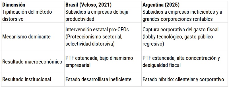 Como si no bastara con los problemas que exponte el caso brasileño, en Argentina reproducimos gran parte de esos rasgos señalados por Veloso, pero con un elemento adicional de complejidad institucional: mientras Brasil subsidia la ineficiencia, Argentina subsidia tanto la ineficiencia como la eficiencia concentrada, generando lo que podríamos denominar una asimetría regresiva del gasto fiscal productivo. El régimen de la Ley de Economía del Conocimiento, por citar ejemplo ampliamente ilustrativo, otorgó cuantiosos beneficios fiscales a empresas tecnológicas de gran escala —como Mercado Libre, Accenture o Globant—, cuyos balances exhiben rentabilidades superiores al promedio del mercado, sin dejar pasar que estas empresas gozan de un elevado grado de eficiencia operativa, un gigantesco volumen económico y financiero, y grandes buffers políticos. En 2023, los beneficios tributarios destinados solo a MercadoLibre representaron casi 1.5 veces el presupuesto anual del Hospital Garrahan, ícono de la salud pública latinoamericana. Desde el punto de vista de la economía política, este patrón refleja una captura del Estado por parte de los sectores más competitivos, que logran institucionalizar sus privilegios mediante estructuras de lobby y normativas a medida. Así, el gasto público resta aún más progresividad y eficiencia: no solo deja de cumplir una función correctiva en torno a fallas de mercado, sino que además se transforma en un sistema de transferencias ascendentes.