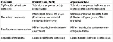 El siguiente Cuadro Comparativo permite observar, en ambos casos, cómo la competencia se sustituye por la influencia, y la política industrial se convierte en una herramienta de distribución de beneficios deliberados vía "gasto fiscal", no de generación de valor y de resolución de problemas relacionados con la matriz socio-productiva.